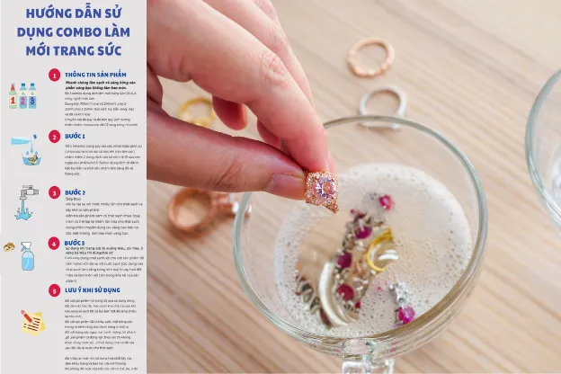 Sử dụng một bát nước ấm (không dùng nước sôi vì có thể gây sốc nhiệt cho đá quý). Pha thêm 2-3 giọt nước rửa chén dịu nhẹ. Tránh dùng các loại có chứa thuốc tẩy hoặc Clo.