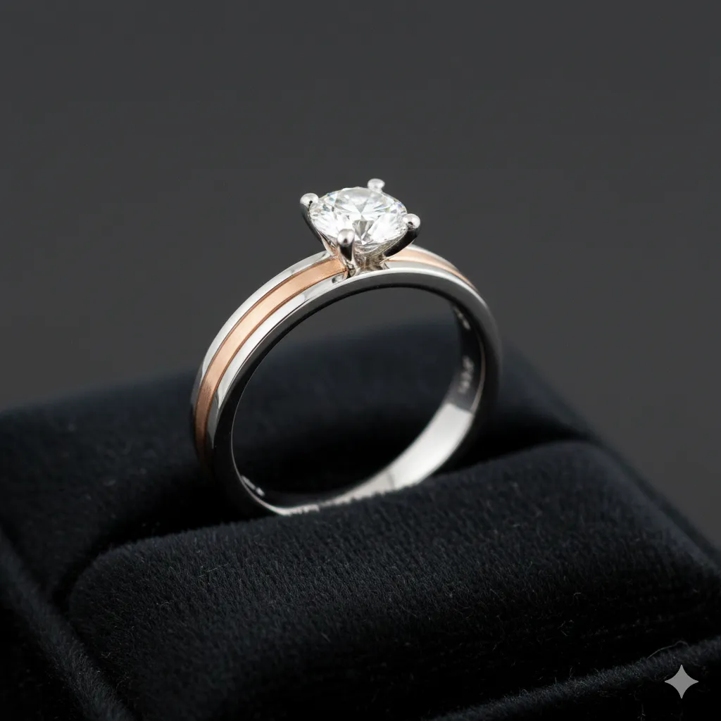 - Sự kết hợp màu sắc: Bạch kim kết hợp điểm xuyết vàng hồng (Rose Gold) tạo nên sự tương phản độc đáo, dành cho những cặp đôi muốn phá cách nhưng vẫn giữ được sự sang trọng vốn có.