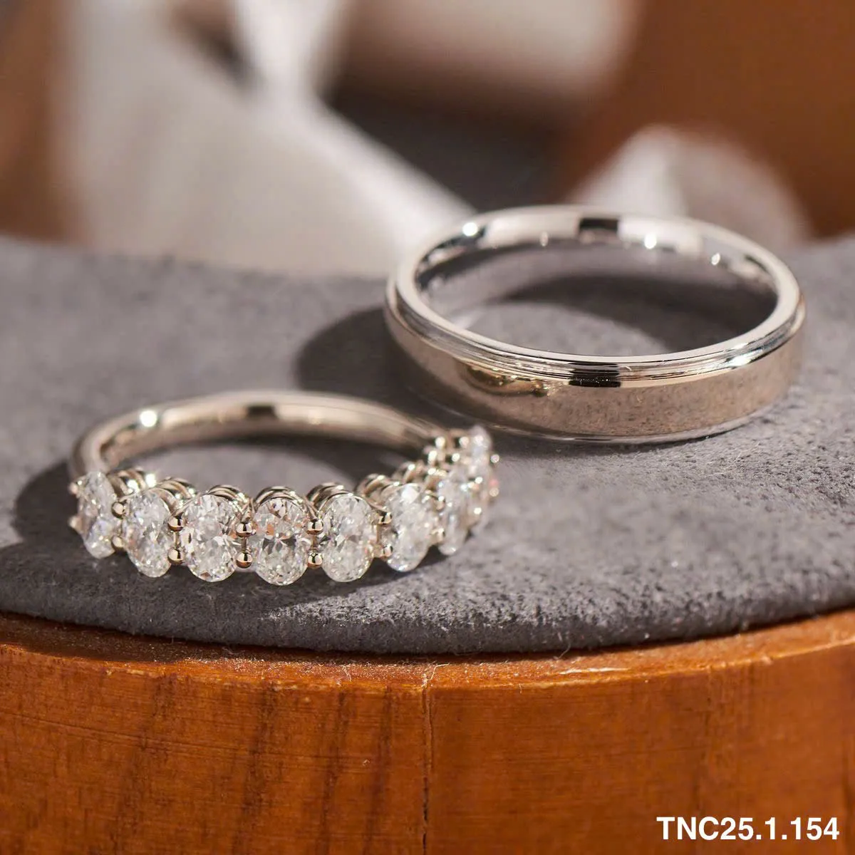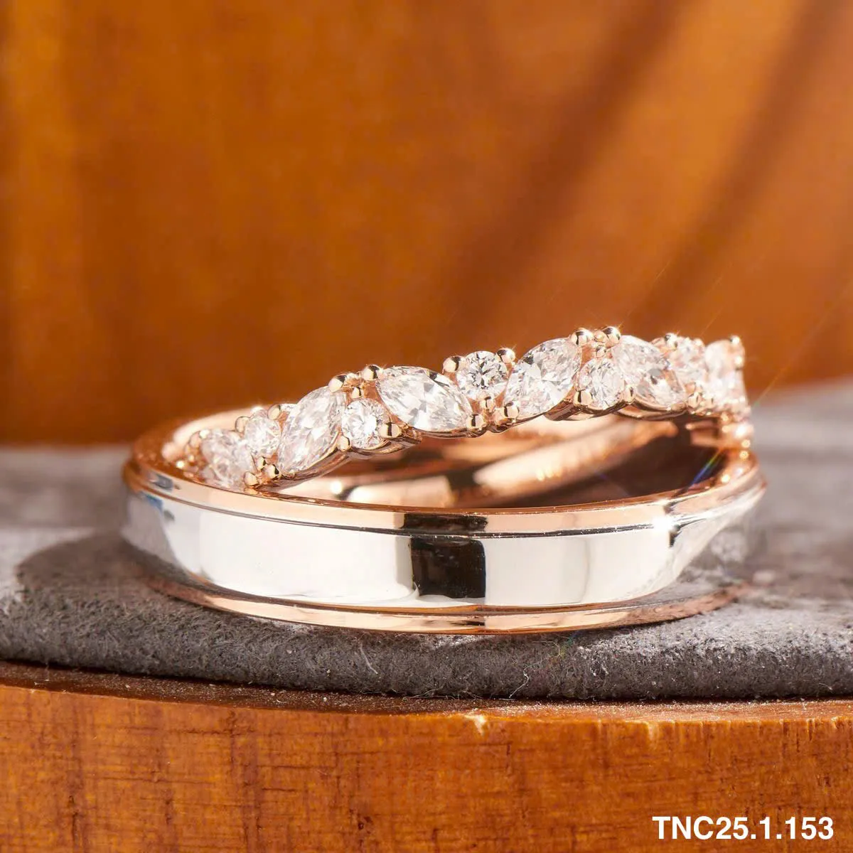 - Thiết kế: Những vòng nhẫn thanh mảnh, bề mặt được xử lý mờ (matte) hoặc phay xước tạo chiều sâu. Một viên kim cương chủ nhỏ nhắn nhưng có độ lửa xuất sắc chính là điểm nhấn kiêu sa.