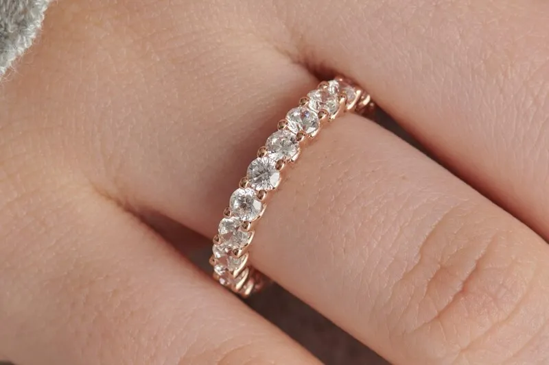 Khác với những kiểu nhẫn truyền thống thường chỉ tập trung vào một viên đá chủ duy nhất (Solitaire), mẫu nhẫn cưới kim cương kiểu Eternity gây ấn tượng bởi một dải kim cương liên tục chạy quanh đai nhẫn.