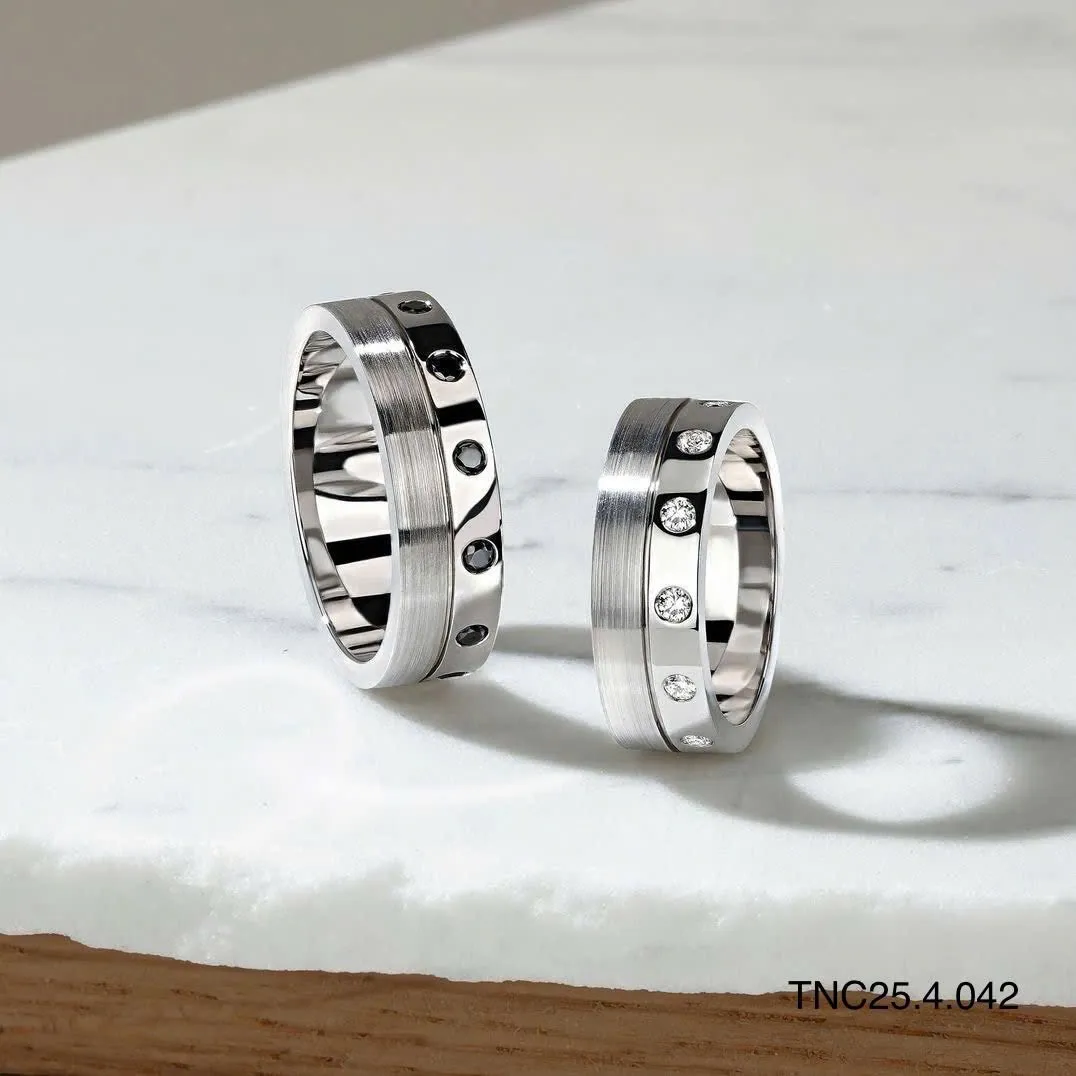 Đây là mẫu nhẫn hướng tới những cặp đôi yêu thích phong cách tối giản nhưng tinh tế. Bề mặt nhẫn được xử lý mờ (Satin finish) tạo cảm giác mịn màng như lụa, không phô trương nhưng cực kỳ cuốn hút dưới ánh đèn sân khấu.
