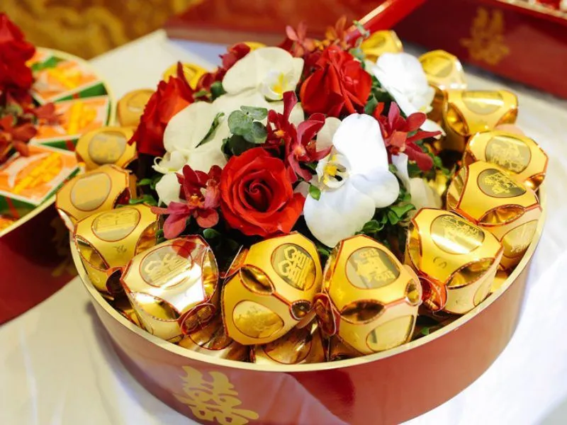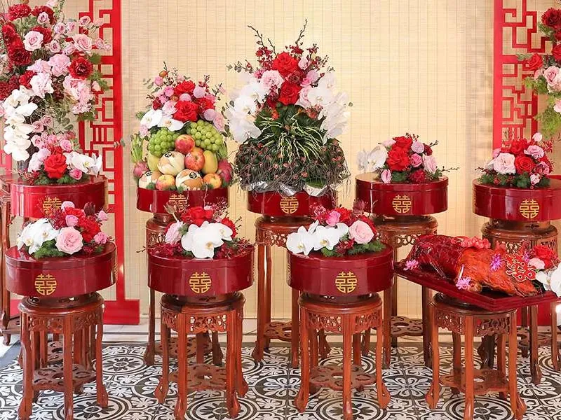 - Trang trí hoa tươi: Thay vì hoa giả, hoa tươi nhập khẩu (như hoa hồng ngoại, hoa lan) được sử dụng để tạo độ mềm mại cho tráp lễ.