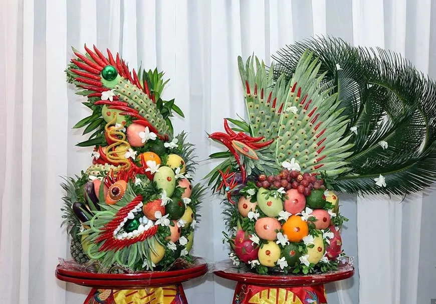 - Lễ vật: Các loại quả tươi ngon như xoài, thanh long, táo, nho... được kết thành hình Chim Phượng rực rỡ.