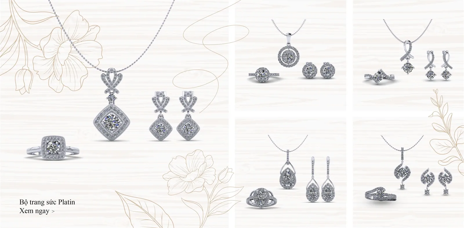 Platin hay còn gọi là Bạch kim là một trong những nguyên tố hiếm nhất trong lớp vỏ Trái Đất. Chất liệu này có khả năng chống xỉn màu, chống ăn mòn cực kỳ cao cùng độ cứng được xếp vào top đỉnh cao khiến cho giá thành của chúng cao gấp 2 lần vàng 9999. Bộ trang sức Platin bao gồm dây chuyền, nhẫn và khuyên tai trong một bộ sưu tập cùng thiết kế sẽ đem đến sự đồng bộ, tôn vinh các nét đẹp trên cơ thể và khiến bạn tỏa sáng.