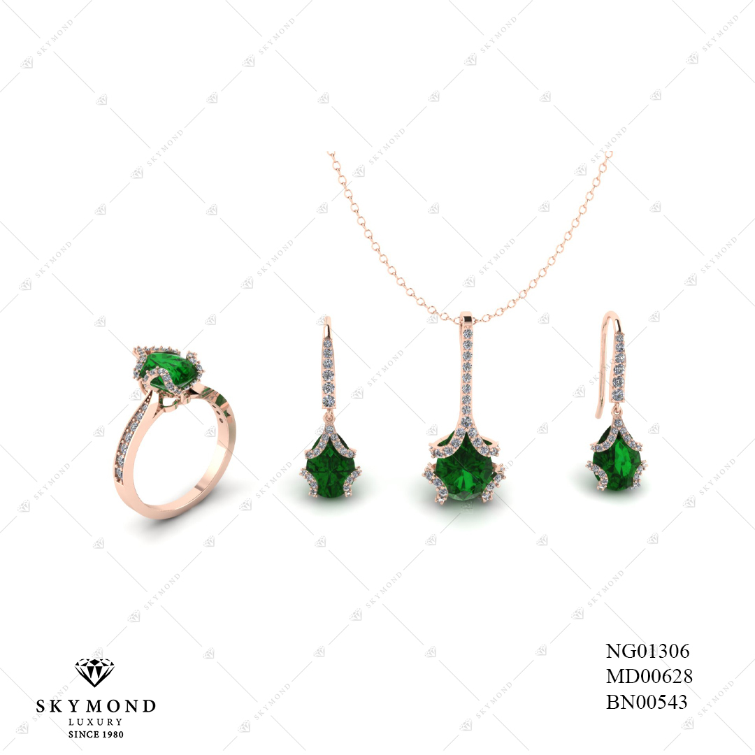 Dây chuyền MD00628, nhẫn nữ NG01306 của Skymond Luxury được làm từ chất liệu Vàng hồng. Đặc biệt, thiết kế này được đánh giá cao bởi sự kết hợp đá Emerald tinh tế, thanh lịch, trẻ trung - đúng với xu hướng chủ đạo của BST Shining Love 2020. Với bộ trang sức này, phái đẹp sẽ thêm phần tự tin khẳng định gu thời trang độc đáo và cá tính riêng biệt của mình.