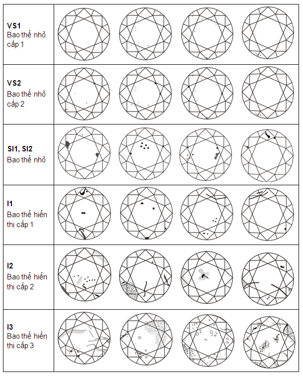 Độ tinh khiết đánh giá mức độ có khuyết điểm bên trong (bao thể) và bên ngoài (tạp chất) của kim cương. Thang đo từ FL (Flawless - hoàn hảo) đến I (Included - có tạp chất rõ ràng).