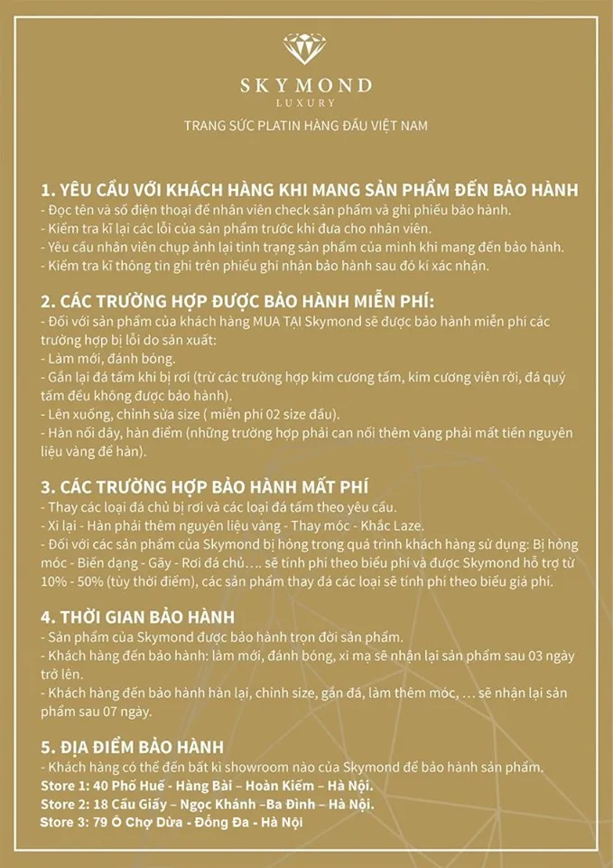 Skymond Luxury là thương hiệu hiếm hoi có chính sách “Bảo hành trọn đời miễn phí” như dịch vụ xi mạ, làm mới, chỉnh size, gắn đá cho khách hàng mua sản phẩm tại toàn bộ các cửa hàng trên toàn hệ thống. Đặc biệt, khách hàng chỉ mất từ 3 – 7 ngày sẽ nhận được sản phẩm bền đẹp như mới. Cùng với đó là chế độ bảo hành trọn đời miễn phí (xi mạ, làm mới, gắn đá, chỉnh sửa size tay), Chính sách thu đổi rõ ràng kèm giấy đảm bảo từ Công ty Cổ phần Skymond, Giấy kiểm định đá quý cùng những Cam kết tuyệt đối.