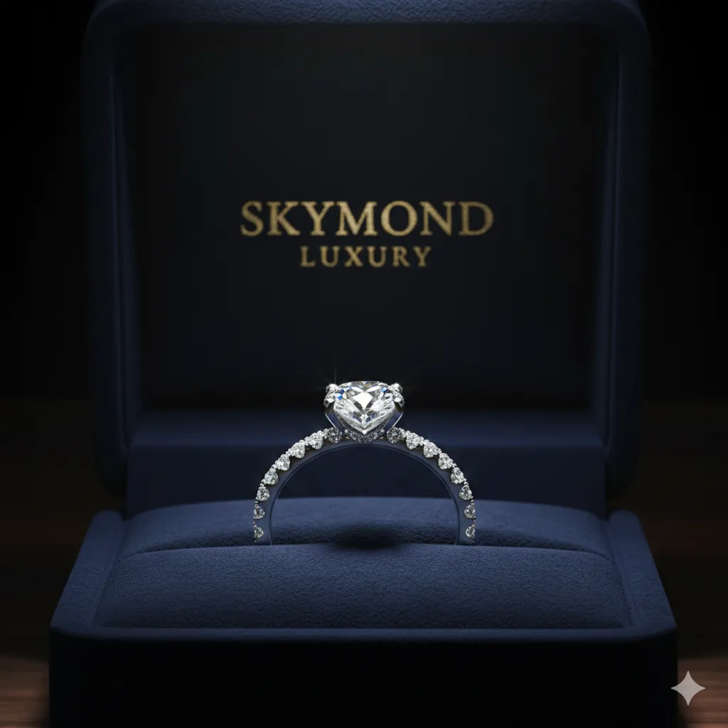 Linh hồn của nhẫn cầu hôn là viên kim cương chủ. Skymond Luxury cam kết sử dụng những viên kim cương tự nhiên được kiểm định bởi GIA (Viện Đá quý Hoa Kỳ) – tiêu chuẩn uy tín nhất thế giới. Mỗi viên đá đều sở hữu giác cắt hoàn hảo, tạo độ tán sắc rực rỡ dưới mọi góc nhìn.