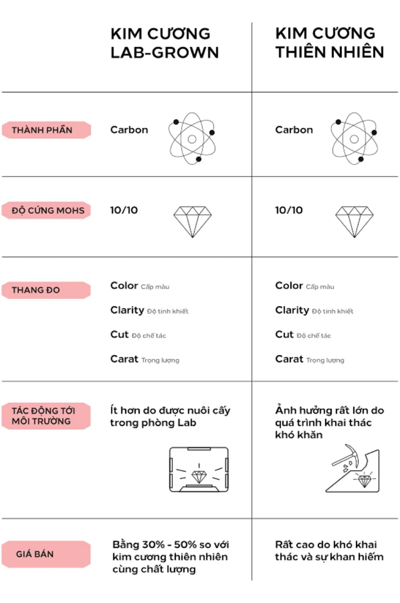 - Kim cương lab-grown: Giá thành thấp hơn từ 30-50% so với kim cương tự nhiên, nhưng không phải là lựa chọn tối ưu cho việc đầu tư do giá trị bán lại thấp.