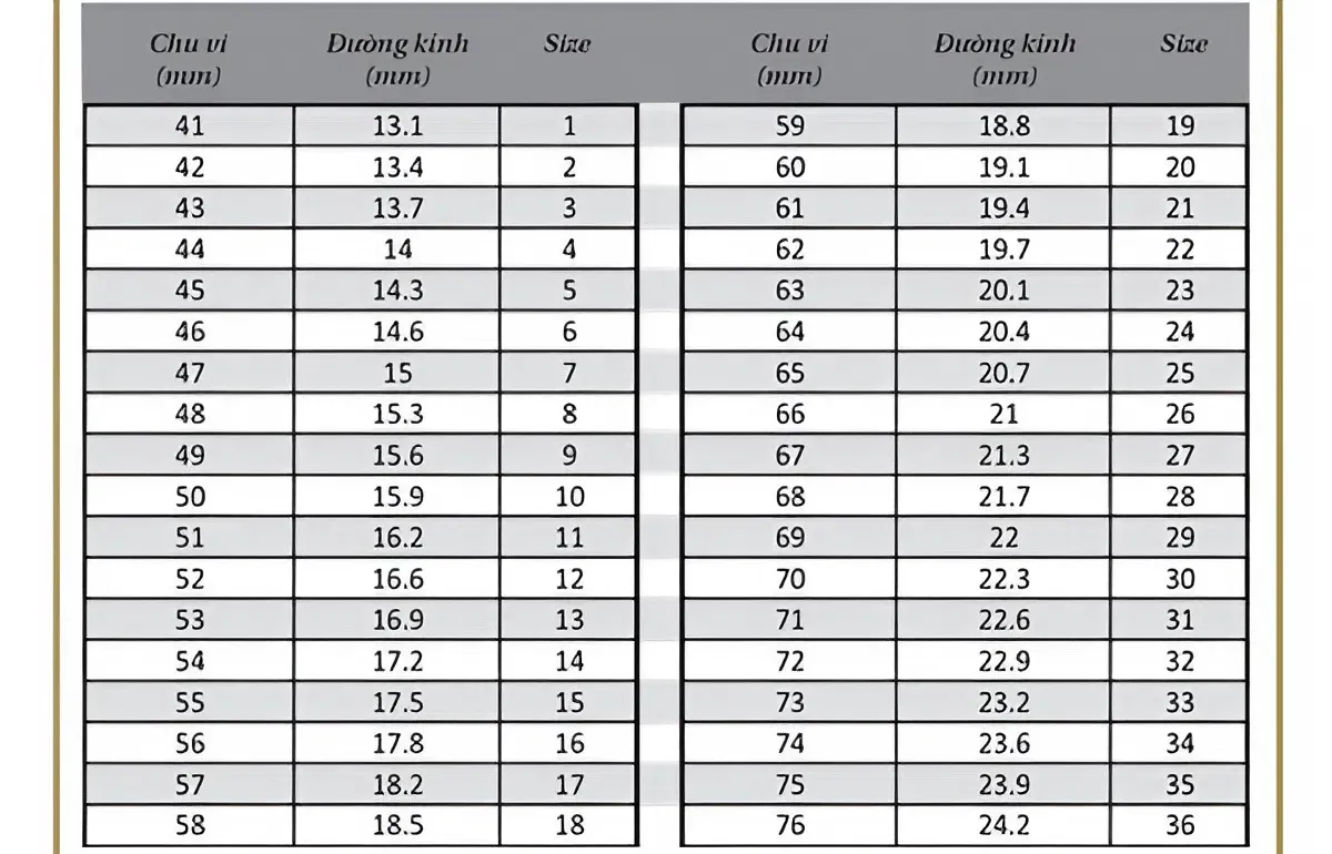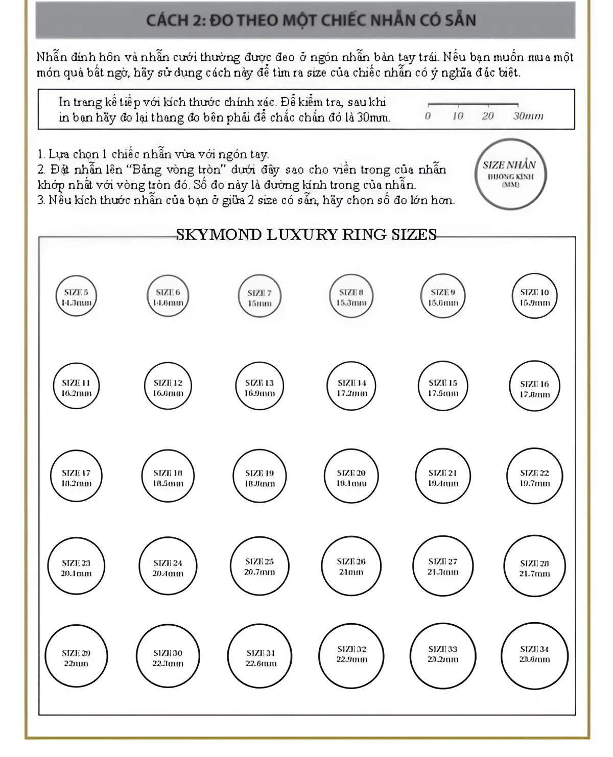 - Bước 2: Đối chiếu số đo đường kính (mm) vừa đo được với Bảng Size Nhẫn chuẩn của Skymond Luxury (ví dụ: đường kính $16.3 \text{ mm}$ tương ứng với size 11).