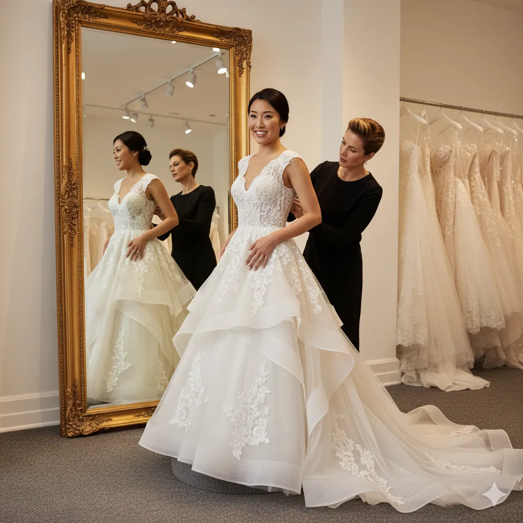 - Không Tuyệt đối Vừa vặn: Dù có thể chỉnh sửa, nhưng váy may sẵn không thể đạt được độ ôm sát tuyệt đối như may đo váy cưới.