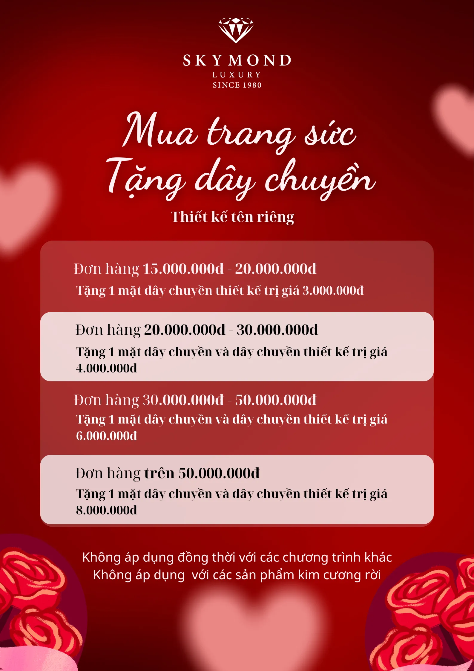 Valentine là dịp hoàn hảo để bạn thể hiện tình yêu bằng những món trang sức đẳng cấp. Từ ngày 01/02 - 15/02/2025, khi mua sắm tại Skymond Luxury, bạn sẽ nhận ngay quà tặng đặc biệt trị giá lên đến 8.000.000đ!