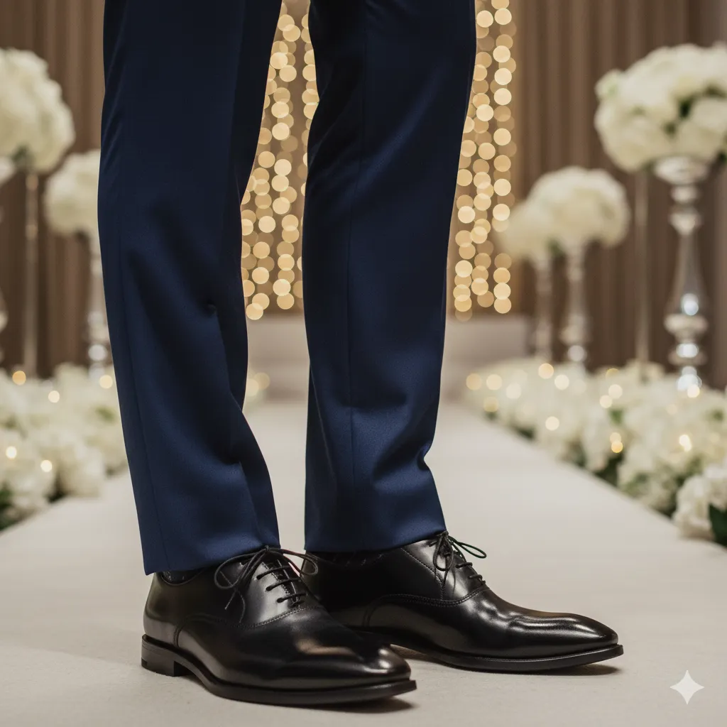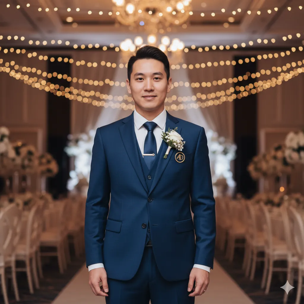 | Xanh Navy (Navy Blue) | Trẻ trung, linh hoạt, hiện đại. | Mọi dáng người, tiệc cưới hiện đại, ngoài trời. | Chú rể mặc vest xanh navy, pin cài áo kim loại, phong cách trẻ trung. |
